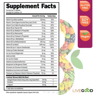 Our LiveGood Bio-Active Complete Multivitamin for Women is strategically formulated with the highest quality ingredients at the optimal dosages to give your body 24 different vitamins and minerals that most people are not fully getting from their food…all for a price that everyone can afford.