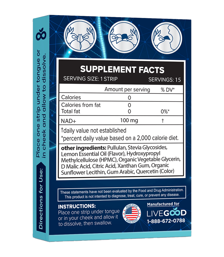 Las tiras disolubles LiveGood NAD+ están diseñadas para ayudar a mantener niveles saludables de NAD+ , para que sus células puedan funcionar de la mejor manera.